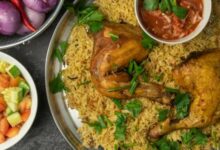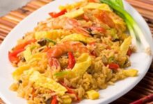 - نسكب الأرزّ بعد الاستواء في وعاء التقديم ونزيّن بمقدار المعلقتين من الخليط التي أُزيلت من الخليط سابقاً للتزيين مع رشّ اللّوز المحمّص.