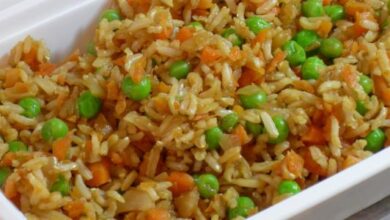 - نسكب الأرزّ بعد الاستواء في وعاء التقديم ونزيّن بمقدار المعلقتين من الخليط التي أُزيلت من الخليط سابقاً للتزيين مع رشّ اللّوز المحمّص.