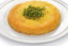 - قلب صيينة الكنافة مباشرة في طبق مناسب للتقديم، ثمّ توزيع القطر عليها حسب الرغبة ثمّ تزيينها بالفستق الحلبي الناعم.