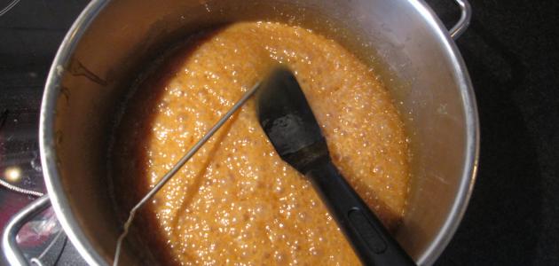 تقلّب الصلصة لمدة ستين دقيقة أو حتى تصل درجة حرارتها مئتين وأربعين درجةٍ مئوية وتتشكّل كرة ناعمة متماسكة.