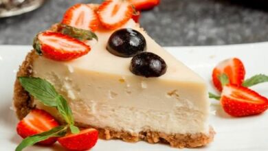 - وضع التشيز كيك في البراد حتى يتماسك مجدداً، ثمَّ تزيينه بالبسكويت والتوت.