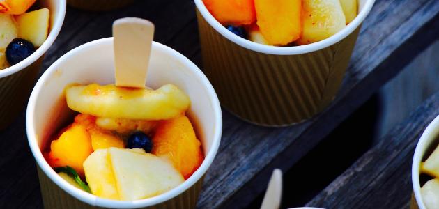 - خمسة أكواب من الفواكه المتنوعة الطازجة المقطّعة (كيوي، مانجا، بابايا، فاكهة النجمة والأناناس).