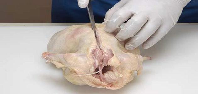 - نقطع الصدر من الجانب نحو الأسفل حتى نشعر بغضاريف الدجاجة، وعند وصولنا للغضاريف فإنّ هذا يسهّل علينا عملية فصل الصدر، فعندها نفصل الصدر باستخدام السكين مع مراعاة تمريرها من المنطقة السفلية للغضاريف وصولاً إلى جانبي الدجاجة بحيث ينفصل الصدر، ونكرّر نفس العملية مع الجانب الآخر.
