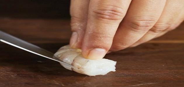 - نلاحظ وجود خيطٍ أسود اللون، على امتداد الظهر، وهذا الخيط يعتبر الأمعاء التي تحتوي على الأوساخ والسموم، لذلك عدم إزالتها سيشكل خطراً على صحة الإنسان في حال أكلها، حيث يتمّ إزالة هذا الخيط إذا لم يكن بارزاً من خلال شق الظهر في المنطقة التي تحتوي على الخيط باستخدام سكينة رفيعة، ثم نسحب الخيط بحذر، أمّا إذا كان الخيظ ظاهراً وبشكلٍ واضح على الظهر، فيتمّ سحبه مباشرة دون شق الظهر، ولكن في حالة قطع الخيط أثناء السحب، سيكون من اللازم شّق الظهر لاستخراج الجزء المتبقي.