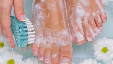 - يُفرك الكعبين، وجوانب القدم باستعمال حجر الخفاف، أو جهاز تنظيف القدمين.