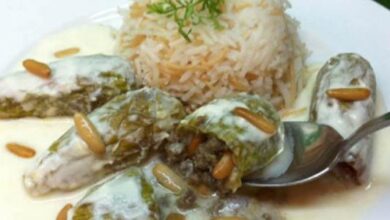 - نحشو البطة بالأرز الذي طبختاه ونغلق بطنها بواسطة عيدان، أو بواسطة خيط.