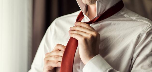 - توضع ربطة العنق حول الرقبة بحيث يكون منتصف ربطة العنق متدليّاً أمام الصدر.