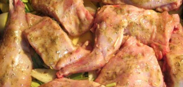 - يقطع الأرنب إلى أربع قطع ومن ثم ينقع بالدقيق والملح وعصير الليمون لمدة ساعة، وبعدها يُغسل جيداً بالماء البارد.