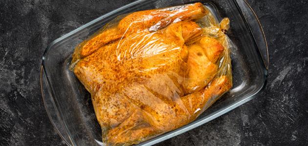 توزيع خليط البهارات داخل وخارج الدجاجة مع محاولة إدخاله بين الجلد واللحم دون تمزيقه ثم وضع الدجاجة في كيس ووضعها في الثلاجة لعدة ساعات أو لليوم الثاني.
