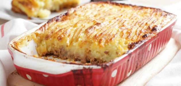 • توضع البطاطس المهروسة في صينية الفرن، ومن المهم توزيعها بشكلٍ متساوٍ، وأيضاً من المهم أن تشكل البطاطس قاعدة سميكة الحجم ومتماسكة.