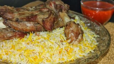 • نضع اللحم، والأرز في طبق التقديم، ونقدمه ساخناً.