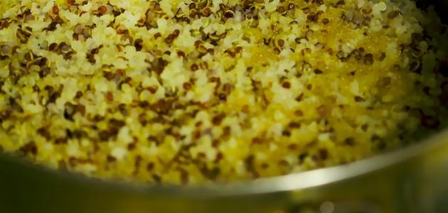 غلي مقدار كوب من الماء في قدر عميق على نار متوسطة الحرارة، وإضافة الكينوا إليه مع التحريك، وإضافة القليل من الملح والفلفل الأسود. خفض الحرارة أسفل القدر إلى منخفضة، وطهي الكينوا مع وضع الغطاء على القدر لمدة عشرين دقيقة تقريباً أو إلى أن يتم امتصاص السائل كله. رفع القدر عن النار وتركه لمدة خمس دقائق حتى يرتاح، ثم يتم رفع الغطاء وتحريك الكينوا بالشوكة بخفة. تسخين الزيت في قدر متوسطة الحجم على نار متوسطة الحرارة، وإضافة البصل، وطهيه مع الزيت إلى أن يطرى ويصبح أشقر اللون. إضافة عصير وبشر قشر الليمون الأخضر إلى البصل، وغلي المزيج لمدة دقيقة واحدة. رفع خليط البصل والليمون عن النار. سكب الكينوا في طبق مناسب للتقديم، وإضافة الزعتر والشبت والبقدونس إليه، وتقليبه قليلاً، ثم إضافة خليط البصل والليمون إلى الطبق، وتقديمه دافئاً.
