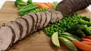 - نحشو قطع اللحم بالخضار ثم نلفها بشكل لفائف.