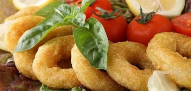 - ينظّف الكلمار ويقطّع إلى حلقات دائرية، ثمّ يترك في المصفاة لحين أن يجفّ.