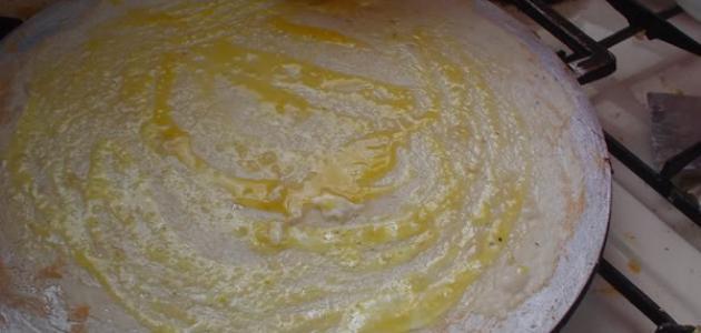 • نسخن مقلاة غير لاصقة على النار، ونضع قطع العجين الممدود فيها، ثمّ نتركها حتى تتحمر وتنضج على الوجهين.