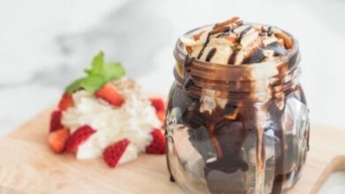 تزيين الآيس كريم بالشوكولاتة حسب الرغبة قبل تقديمه.
