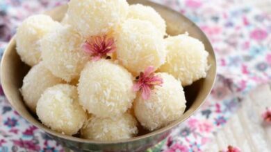 - نُشكل البسكويت على شكل أقراص متوسطة الحجم، ونُغطيها بجوز الهند.