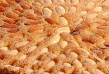 - نُزين كلاً قرص بالفستق الحلبي، ثمّ نُدخل الصينيّة إلى فرن مُسخن مسبقاً إلى أن يشقر لون الأقراص.