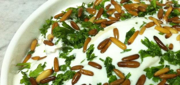 • نُزيّن السطح باللحمة المفرومة المقلية، مع البقدونس المفروم، والرمان، والصنوبر المحمص، ونرشّ كميّةً قليلة من الكمون والبابريكا على السطح.