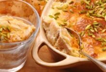 • نوزّع الكمية المتبقية من القشطة على الطبق، ثم ندخله مرة أخرى للفرن، مع تبديل الشبك السلفي للعلوي لكي يتحمّر وجه الطبق جيداً.