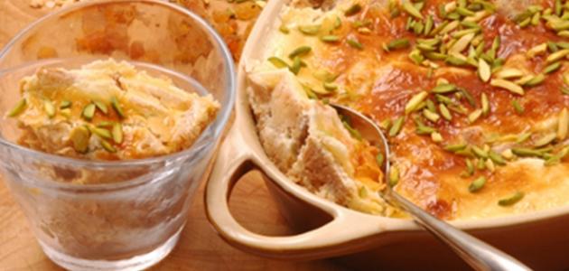 • نضع كمية الخبز المتبقية، ثم نسكب عليها الحليب، وندهن قشطة القيمر على وجه الطبق.