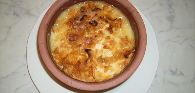 • نقل المزيج إلى صينية بايريكس، ويضاف إليه كمية القشطة، بحيث تغطي الوجه.