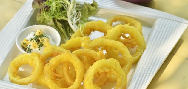 تقطيع البصل الى حلقات بسماكة نصف سنتيمترًا تقريبًا. خلط المقادير الدقيق والنشا والبطاطا المطحونة والشطة الحمراء والملح معًا، ثمَّ إضافة المياه الفوارة، وتقليب الخليط حتى يتجانس. تغطية حلقات البصل بالخليط، ثمَّ بالبقسماط، وتحمير البصل المغلف في كمية وافرة من الزيت الساخن على درجة حرارة 180 درجة مئوية حتى يصبح ذهبيًا. رفع البصل من الزيت ووضعه على رف شبكي للتخلص من الزيت الفائض كي يصبح مقرمشًا، ورشه بالملح وهو ساخن وتقديمه.