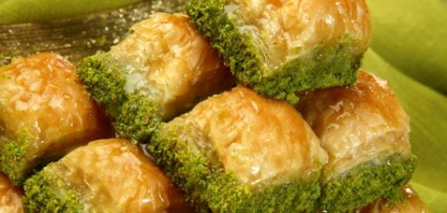 - تقسيم البقلاوة إلى مربعات متساوية الحجم، ثمّ نثر الفستق الحلبي المطحون فوقها.