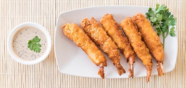 • إمساك حبة من القريدس من الذيل، وغمسِها في العجينة حتَّى تتغطَّى بطبقةٍ سميكة، ومن ثم إسقاطها مباشرة وبحذر في الزَّيت السَّاخن.