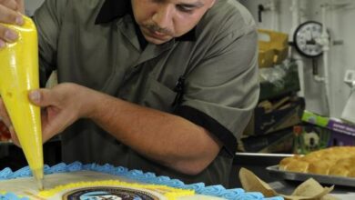 5. يُوضع الجناش في الثلاجة حتى يجمد، ويُمكن استخدامه في تزيين الكيك، أو يُمكن تقطيعه وتقديمه كما هو.