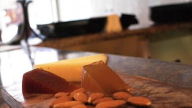 4. يُفرد ورق الزبدة داخل صينية، ثم يُسكب الجناش ويُرتّب على شكل طبقة رقيقة، ثم يُرش عليها الفستق المطحون واللوز المقشر.
