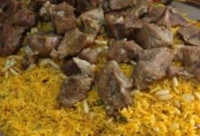 • بعد أن ينضج الأرز، نضعه في طبق كبير، ثم نخرج قطع اللحم من التنور، ونضعها فوقه.