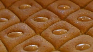 - نقوم بإضافة الحليب المكثّف والزبدة والتمر على العجينة بعد إخراجها من الفرن ونمزجهم جيداً، ونضع العريكة في طبق التقديم ونضع فوقه القشطة والعسل ونزيّنه بالمكسّرات والزبيب وقطع التمر.