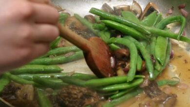 • تشويح الثوم والكزبرة في مقلاة، وإضافتها إلى الفاصولياء، وسكبها في أطباق التقديم وتزيين الوجه بالبقدونس.