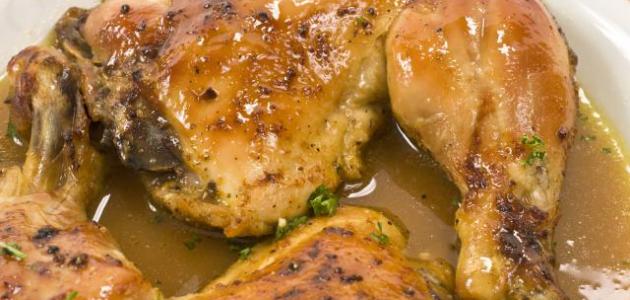 - توضع قطع الدجاج في صينية الفرن، ومن ثم توضع في الفرن المسخن مسبقاً حوالي ساعة من الزمن، وعندما تنضج يتم تحميرها.