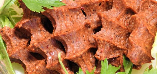 فرم اللحمة مع الِّلية الضاني والماء المثلج(لأن اللحم طازج يسخن عند خلطه بالخلاط لذا يفضل أن يكون اللحم مجمداً قبل يوم فقط ثمّ إخراجها من الفريزر قبل نصف ساعة وخلطها وبالتالي يبقى اللحم محافظاً على لونه) ثمّ إضافة معجون الفلفل الحار .