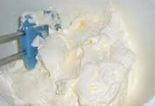 • نخرج الكريمة من الثلّاجة ونكرّر عمليّة الخفق مرّةً أخرى لمدّة خمس دقائق فتنتج طبقة رقيقة فوق الكريمة، نزيلها بالملعقة ونتخلّص منها، ونستمرّ بالخفق حتّى تتكوّن كريمة قوامها يشبه الزّبدة.