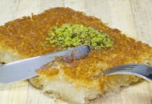 • تنعيم الكنافة من خلال تقطيعها بالسكين بشكل ناعم.