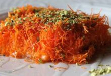 • اقلبي صينيّة الكنافة في صينيّة أخرى مماثلة لها بالحجم ومدهونة بقليل من السمن، ثمّ أعيديها للفرن حتّى تنضج.