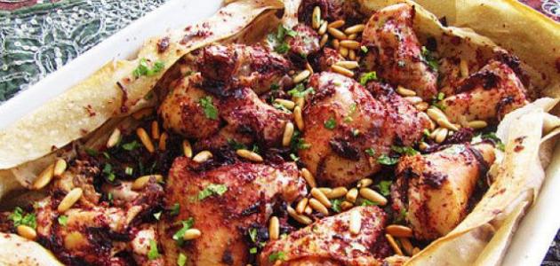 - نصفُّ قطع الدجاج في صينية، ونضع فوقها ما تبقى من البصل.