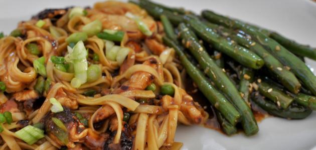 اسلقي النودلز في قدر به ماء مغلي تبعاً للتعليمات الموجودة على العلبة، ثمّ صفيها واتركيها جانباً. ضعي زيت الفول السوداني في مقلاة على نار متوسطة، ثمّ اقلي بها الخضار لمدّة دقيقة، ثمّ أضيفي مرق الدجاج والصويا صوص وزيت السمسم، وأخيراً أضيفي النودلز وقلّبي جيداً، ثمّ زينيها بالبصل الأخضر المقطع.