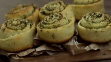 • خلط اللحم البقري المفروم، صلصة البيستو، الماء والزيتون ومزج الخليط قليلاً وتشكيله إلى أربع أقراص برغر.