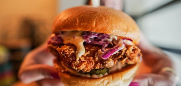 • تشكيل برغر الدجاج على شكل أقراص دائرية بالسمك المرغوب به وتغليفه بالخبز المطحون من كِلتا الجهتين ووضعه في طبق جانبي.