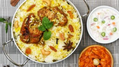 - تقديم طبق البرياني مع الدجاج.