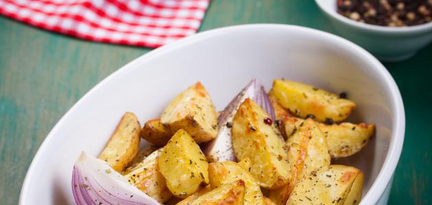 - بعد تقليب البطاطس بالخليط نقوم بفردها بصينيّة مناسبة وندخلها الفرن على درجة حرارة (مئتين مئويّة)، ونضعها فترةً من الزمن حتى تتحمّر وتنضج وتصبح جاهزةً.