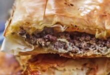 • ثني حواف العجينة على الحشو، ثمَّ وضع رقاقتين من العجينة من أجل تغطية السطح، ودهنها بالزبدة، ثمَّ تكرار العملية إلى أن تنتهي بقية الرقاقات مع دهنها بالزبدة.