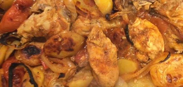- اسكب مكونات الوعاء السابق الذي يحوي الماء ومعجون، ربّ البندورة، والثوم إلى صينية الفرن فوق قطع الدجاج والخضار الأخرى، ثم ضع الصينية بحذر داخل الفرن الساخن لمدة أربعين إلى ستين دقيقة حتى تنضج المكونات بالكامل وتقل كمية الماء إلى النصف تقريباً.