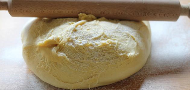 • نرشّ القليل من الدقيق على سطح أملس، ونفرد العجينة عليها، بحيث يكون سمكها ما يقارب 5 ملم.