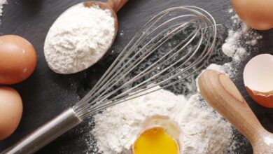 - نضع الدقيق، والملح، والسكر في المصفاة وننخلهما.