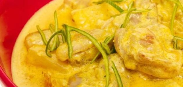- نضيف قطع الدّجاج إلى الخليط السابق، ثمّ نضع فوقها حليب جوز الهند ونقلّب جميع المكوّنات معاً، ثمّ نضيف الملح والفلفل الأسود حسب الرغبة، ونتركه على النار لمدة ثلث ساعة إلى نصف ساعة حسب الكثافة المطلوبة.